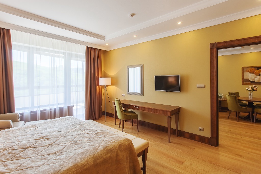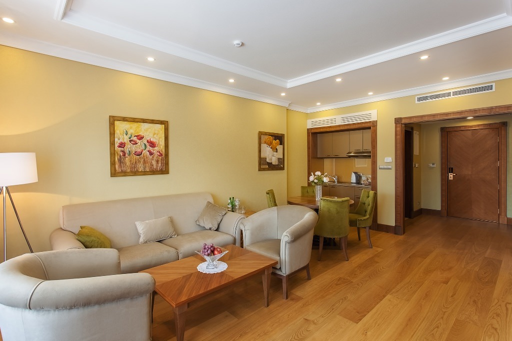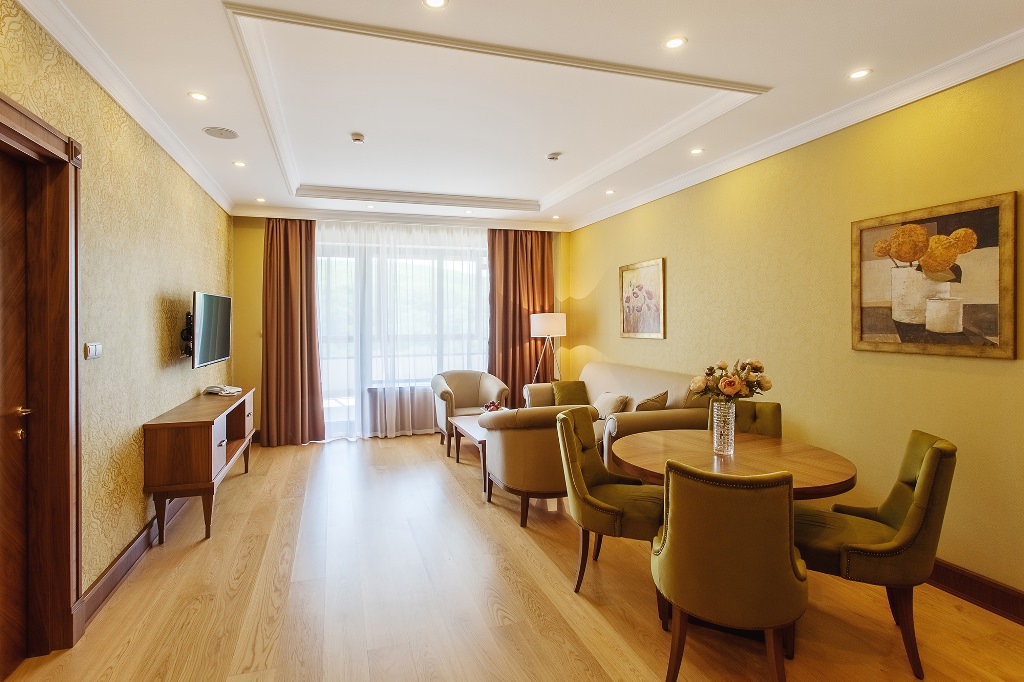 Имеются ванная комната с туалетом и душевой кабиной, гостевой туалет. Предусмотрен кухонный уголок. Общая площадь номера 74 кв.м.