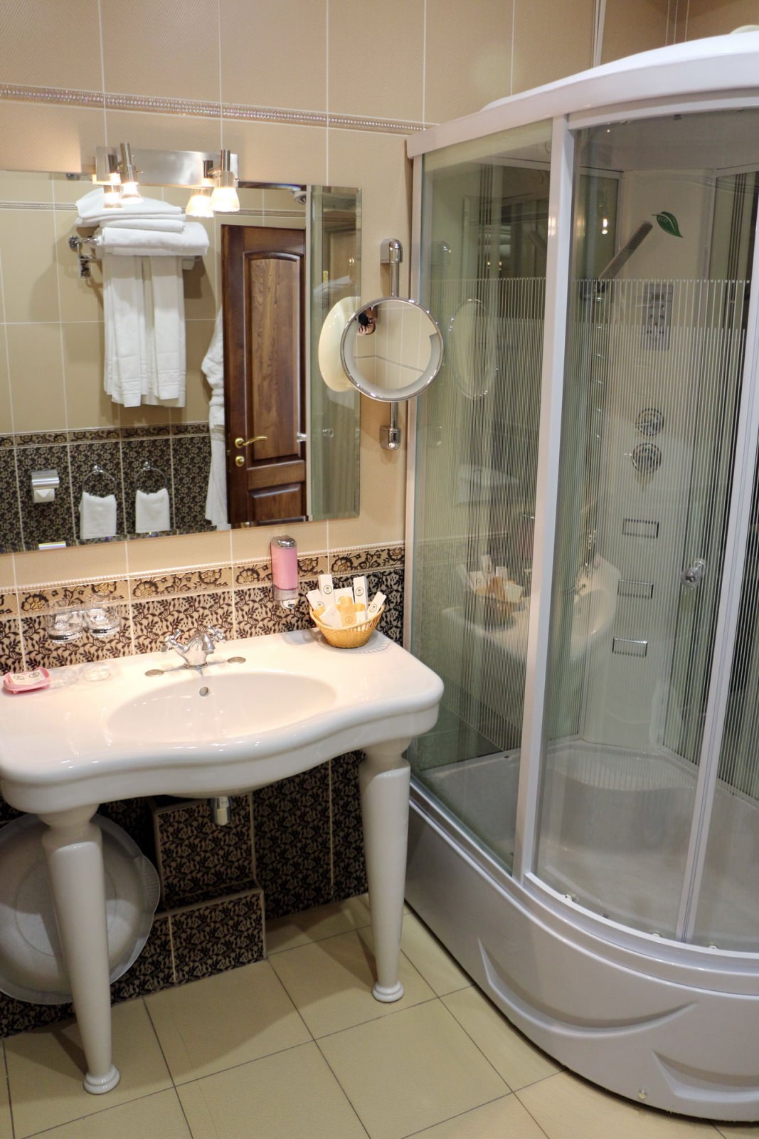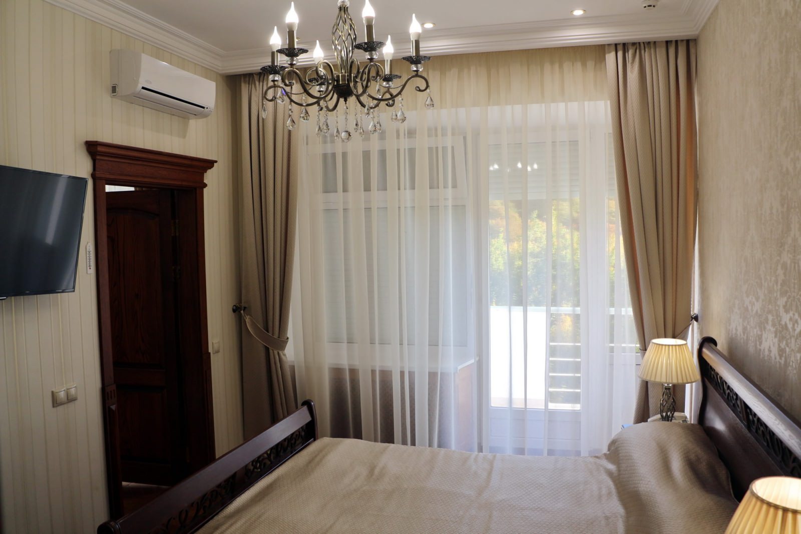 Двухместные номера "Люкс" состоят из двух комнат - гостиной и спальни. Укомплектованы гигиеническими средствами индивидуального пользования (один раз на заезд). Площадь номера 65,2 кв.м.